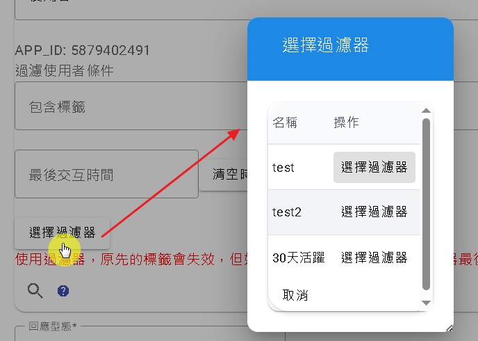 若您希望進行更細緻的篩選(例如排除特定使用者,或組合更複雜的條件),您需要具備「機器人分析者」或「管理者」的權限。