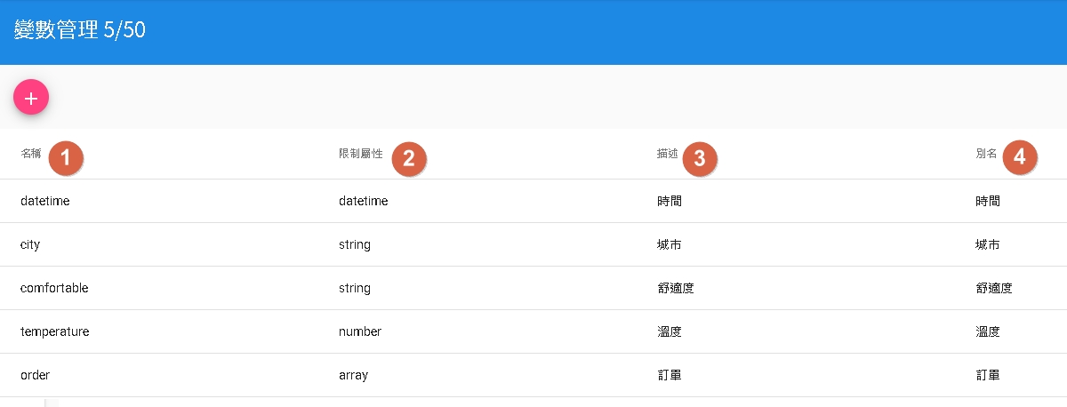 - 名稱: 變數的唯一識別碼,建議使用英文命名(例如