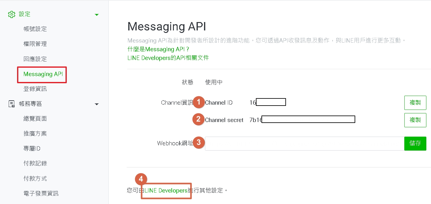 - 填入剛剛獲取的 Channel ID、Channel Secret 以及 Channel Access Token。