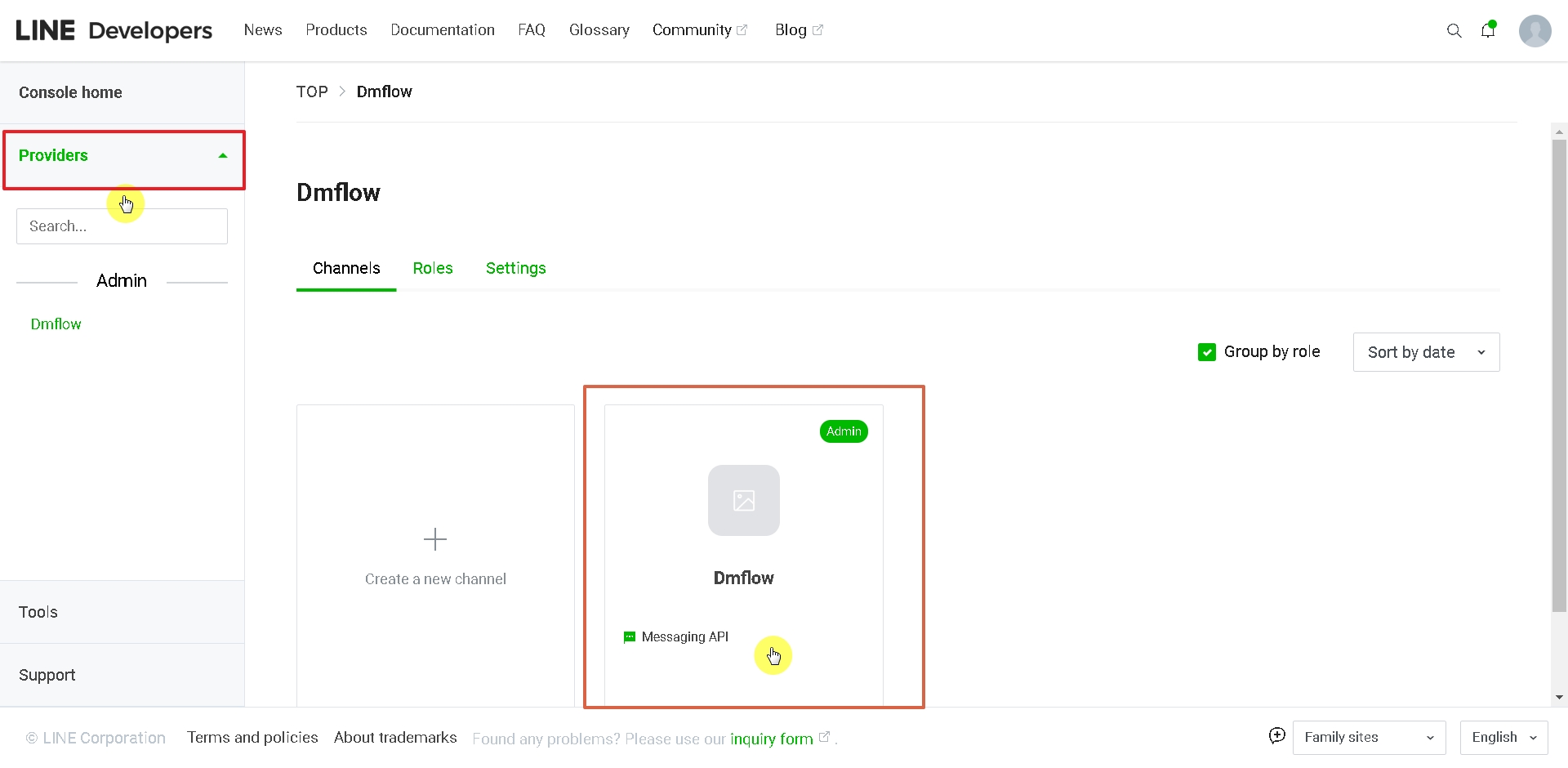 點選頁面上的連結進入 LINE Developers 控制台,並依照下圖順序操作: