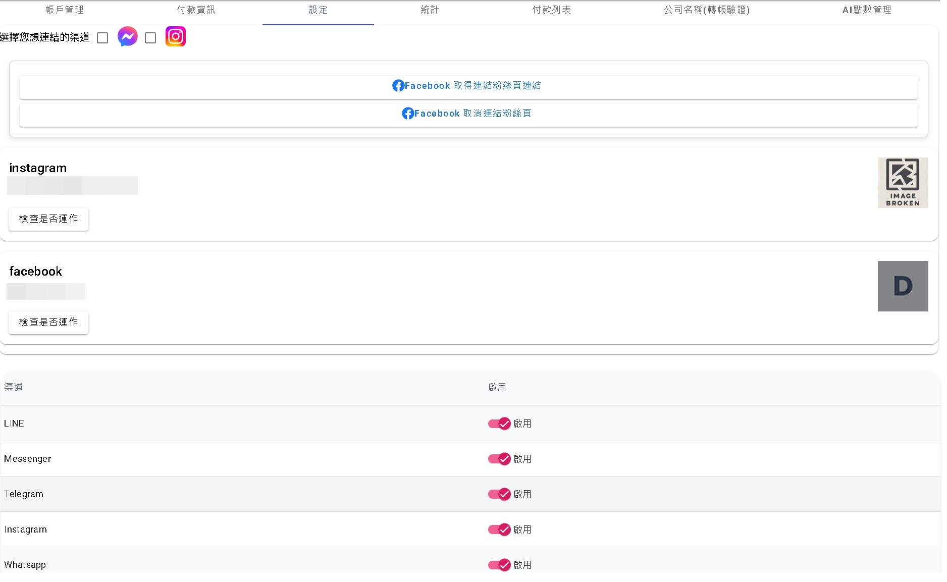 - 重要提醒: 若要開啟某個渠道的整合功能,請務必先確認該渠道已切換為「啟用」狀態。