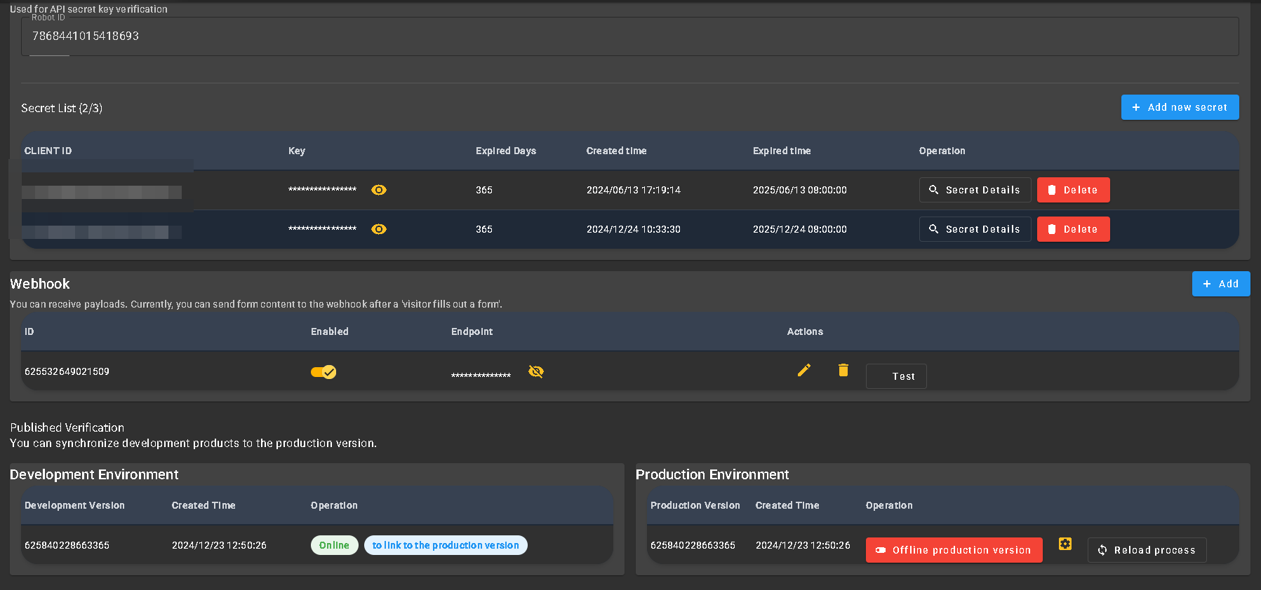 發布頁面掌管了機器人對外溝通的三大命脈:密鑰列表、Webhook 以及 發布管理。